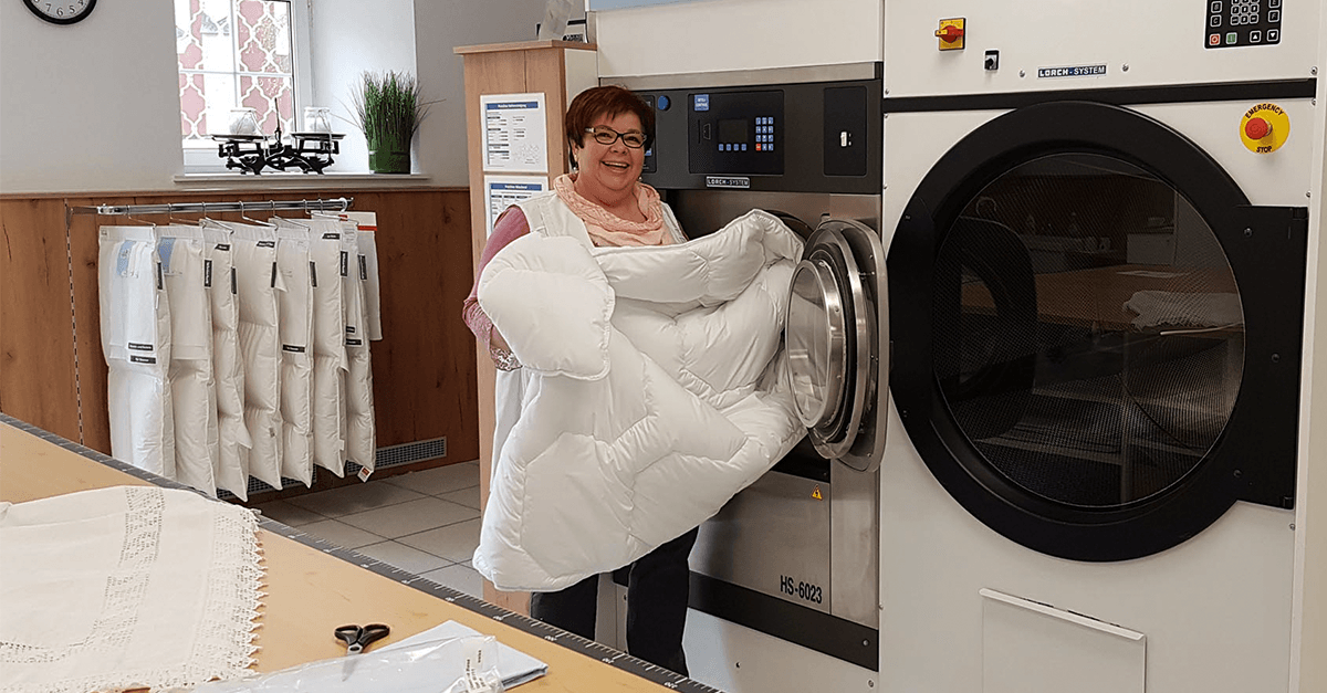 „In unserer großvolumigen 28kg Waschmaschine waschen wir alle Betten,  die in der Haushaltswaschmaschine nicht Platz haben,  bei 60°C und ohne chemische Bleichmittel. Wir waschen Kommissionsweise, das heißt: pro Kunde und nicht mit fremden Betten gemischt. Anschließend werden diese im großvolumigen Trockner getrocknet und dabei mit UV-Licht desinfiziert!“, erzählt Gertraud Deutsch, die „Frau Holle“ von Betten Ammerer.